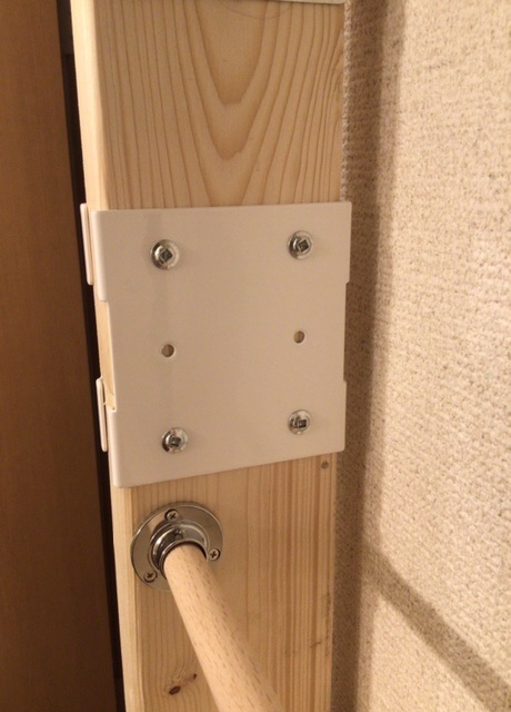 我が家のマンションの床から天井までの高さは約230センチ。さすがにそんな長い木材を自家用車で運ぶのは厳しいので、長さを2つに分けて購入。実際に組み立てるときに、この四角い金具で上下連結させます。