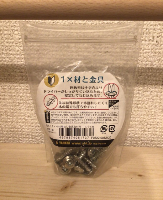 このビスはDIYで大活躍するビス。事前の穴あけ不要で、初心者がツーバイフォーでDIYする時に非常にオススメです。ホームセンターで購入。