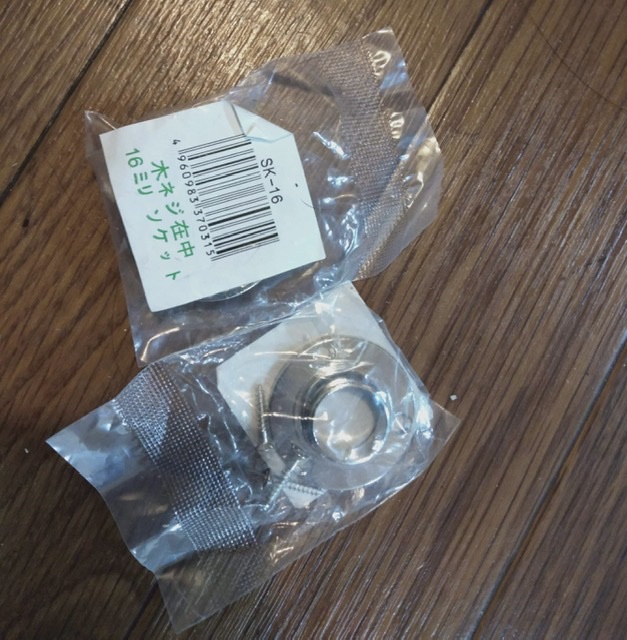 丸い棒の受け皿になる金具(ソケット)。直径16ミリで一個140円。
